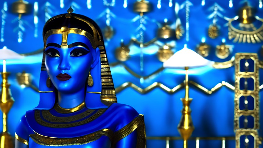 A striking statue with a radiant blue face and traditional Egyptian headdress stands prominently against a blue background with ornate...