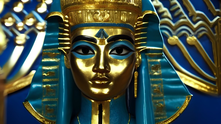 A close-up shot captures the striking details of a blue and gold Egyptian-styled bust. Intricate patterns and rich colors evoke a sense of...