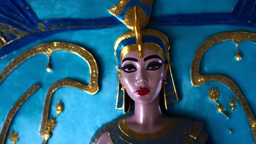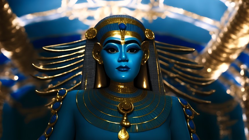 A striking blue and gold representation of an Egyptian queen or deity dominates the foreground, with a serene expression and elaborate...