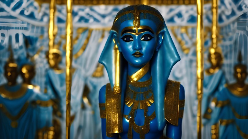 A striking blue and gold figure resembling an ancient Egyptian deity or royalty is showcased, set against a background with an ornate...